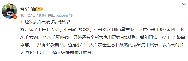 “除了小米15系列、小米澎湃OS2、小米SU7 Ultra量产版,还有小米平板7系列、小米手表S4、小米手环9Pro,另外还有全新大家电高端Pro系列、智能门锁、Wi-Fi 7 路由器等。一共有16款新品,这是小米「人车家全生态」战略的成果集中展示。发布会时长大约3个小时,还请大家提前做好准备。”