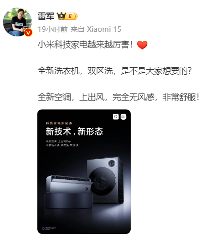 10月27日,雷军发微博正式介绍,将在10月29日小米15系列发布会上,推出全新的双区洗衣机。