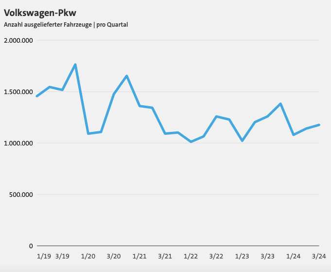 △大众季度交付车辆数值曲线图(来源:德国今日新闻网站)