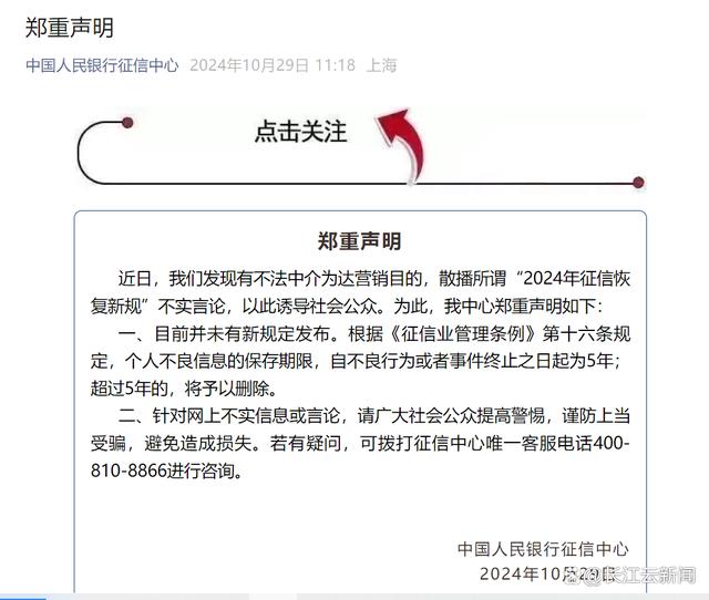 对此消息,10月29日,中国人民银行征信中心发布声明称,近日,中国人民银行征信中心发现有不法中介为达到营销目的,散播所谓“2024年征信恢复新规”不实言论,以此诱导社会公众。