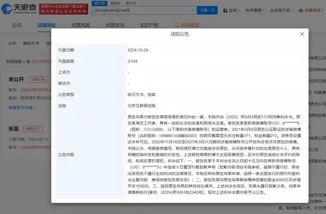据天眼查APP显示,10月29日,因被告张某某未履行致歉义务,肖战申请强制执行,并公开该案判决主要内容。