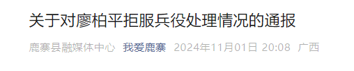 11月1日,广西鹿寨县融媒体中心发布情况通报,2024年9月1日批准入伍青年廖某某,因个人思想原因,拒服兵役被部队作除名处理退回。