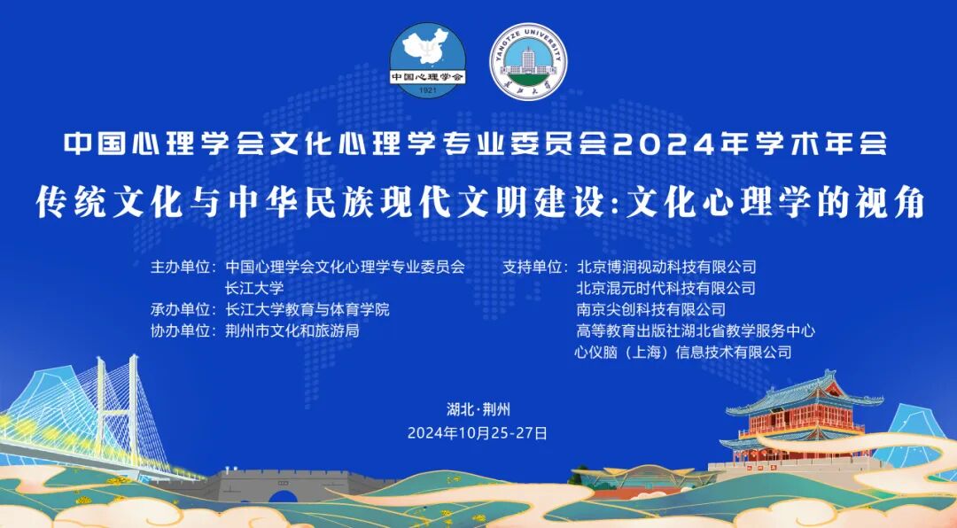 2024年10月25日-27日,中国心理学会文化心理学专业委员会2024年学术年会,在美丽的中国历史文化名城荆州举行。本次年会由中国心理学会文化心理学专业委员会和长江大学主办,长江大学教育与体育学院承办,荆州市文化和旅游局协办。年会围绕“传统文化与中华民族现代文明建设:文化心理学的视角”这一主题,共开展主题报告12场、专题论坛9场、分组论坛9场和圆桌对话1场、工作坊3场。来自全国多所高校、科研院所和文化产业领域的三百余名专家学者、青年学生和关注中华民族现代文明建设的社会人士报名参会。年会在线观看人数近5千人次,直播高峰热度达到8万+。