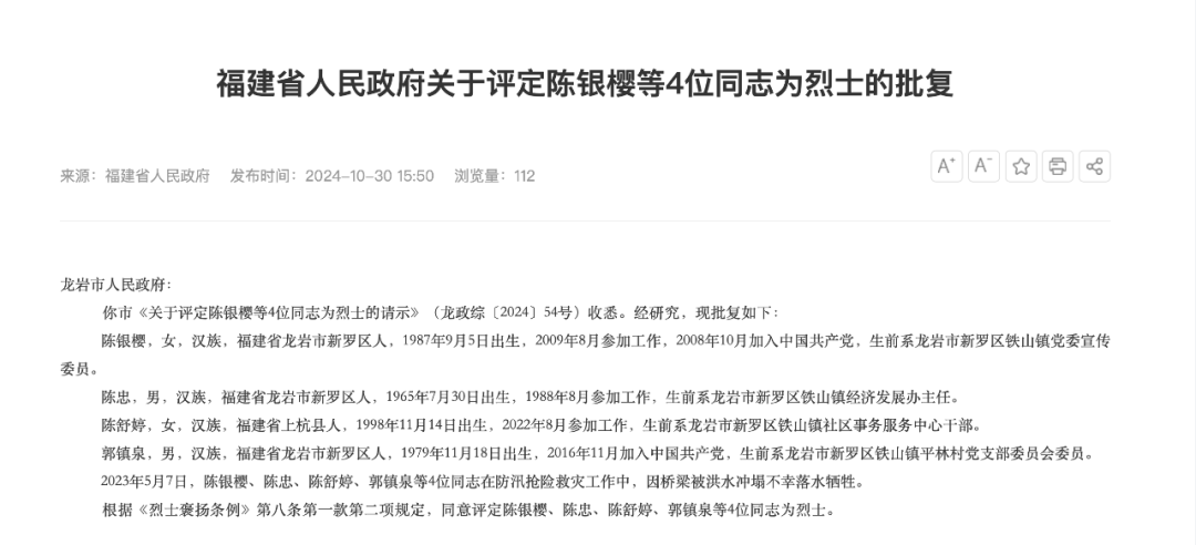 2023年5月,福建龙岩市新罗区遭遇60年来最大短时强降水。在龙岩市新罗区开展防汛巡查、组织群众转移避险时,陈银樱、陈忠、陈舒婷、郭镇泉4人到达平林桥,桥面突然坍塌,4人瞬间被洪水卷走后牺牲。