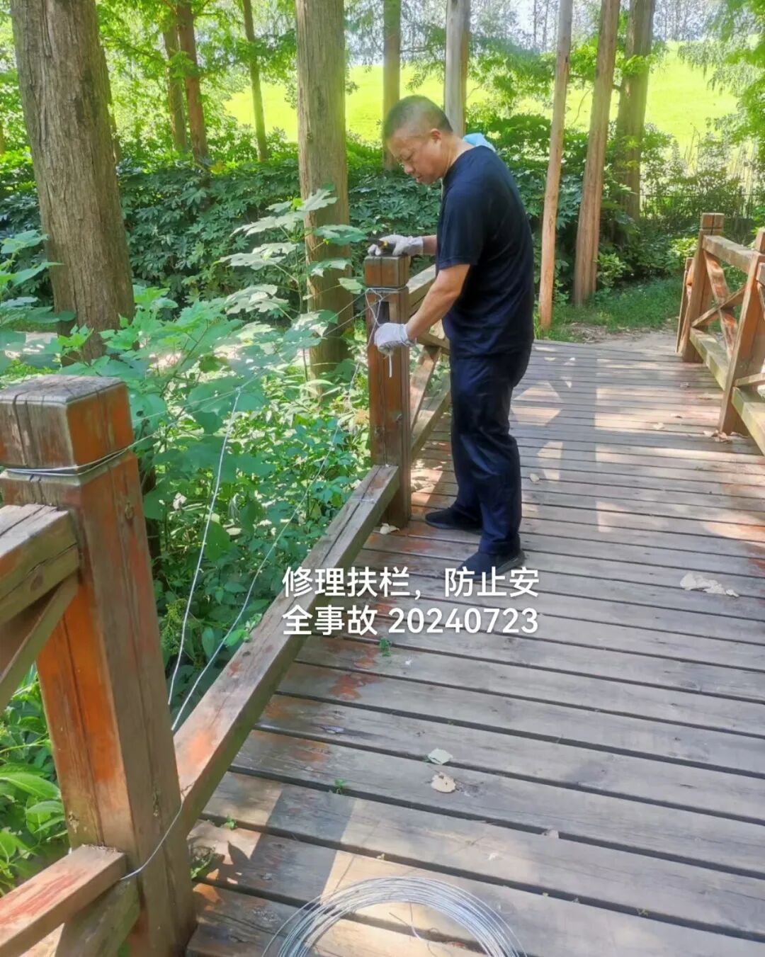 今年7月,鞠守元发现新沟生态公园一处河岸边的木质护栏损坏严重,有的已经掉落下去,留下一个缺口。“万一有小朋友过来玩,不小心掉河里了可咋办?”来不及多想,鞠守元当即购买所需工具,重新加装护栏,直至修护完成并安装防溺水警示牌后,他才放心离去。