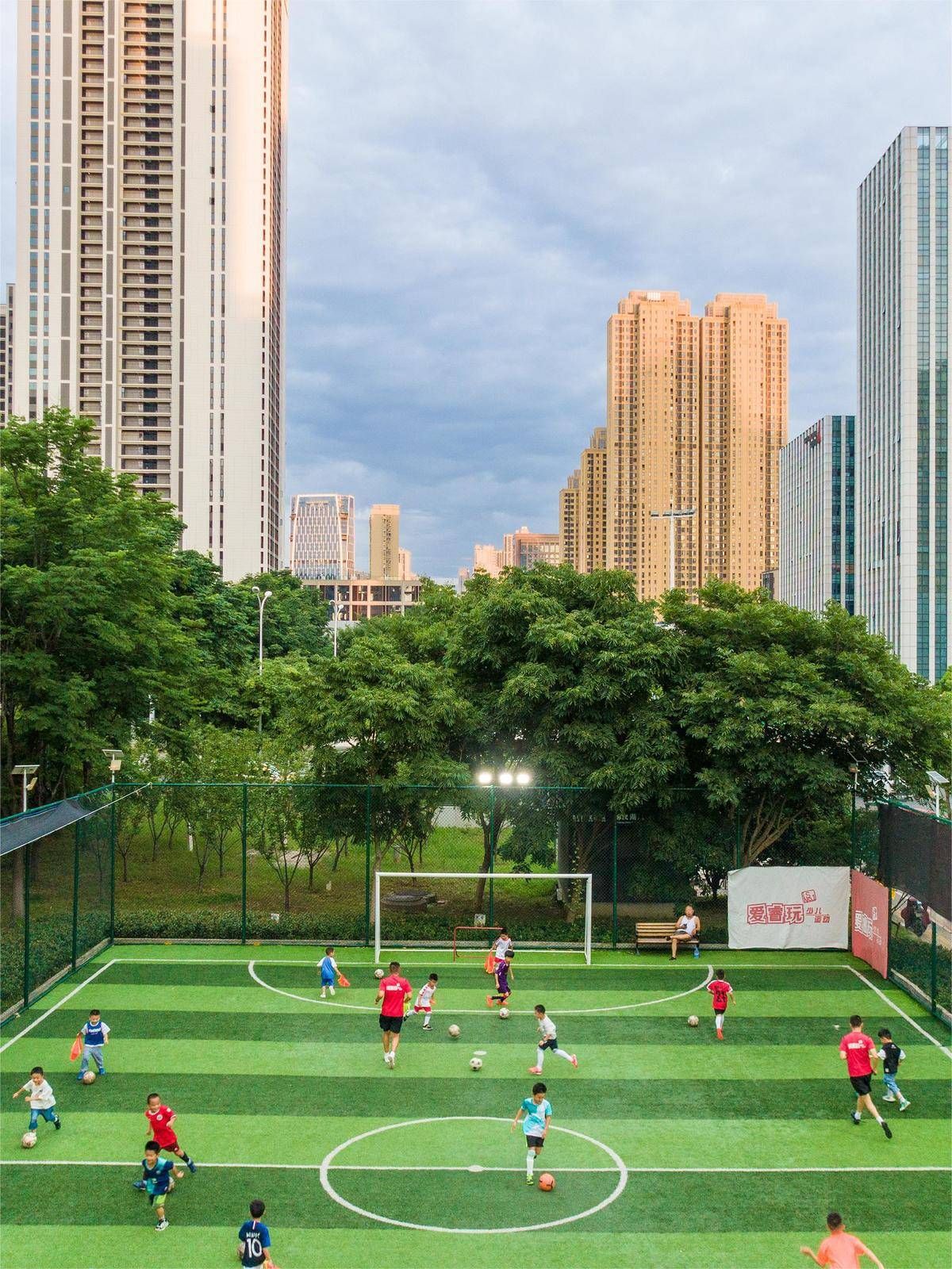 2023年7月4日傍晚,在武汉的绿柳路足球公园,小朋友们在标准制的七人足球场内训练。2020年以来,武汉市启动“城市公园绿地5分钟服务圈”构建行动,大规模建设“口袋公园”,利用微小空间让城市“深呼吸”,实现让居民出门5分钟即可走进公园绿地,让人们在车水马龙中找到一片惬意的歇脚地。 (湖北日报全媒记者 任勇 摄)