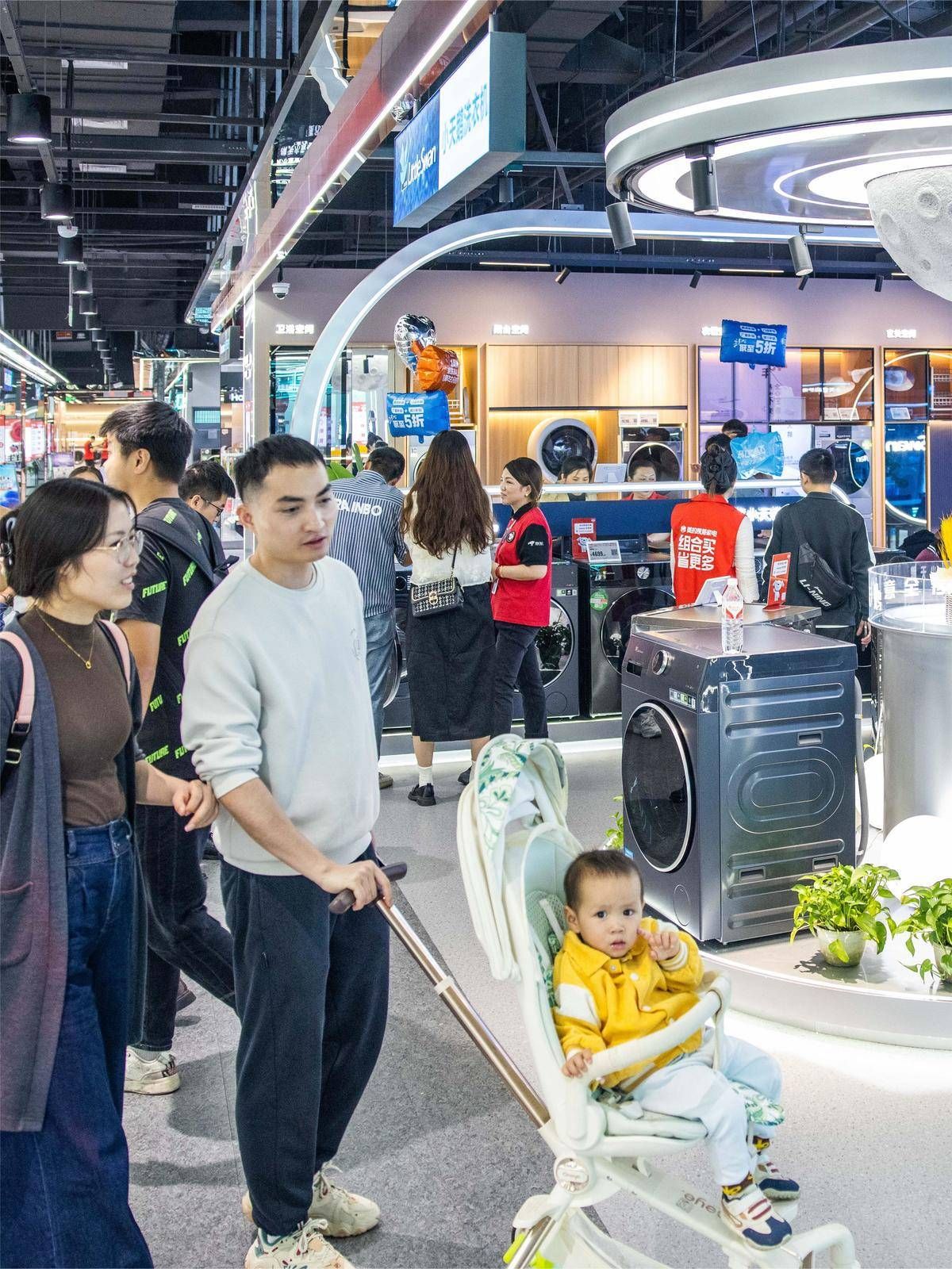 11月3日,武汉京东MALL店内,消费者正在选购家电用品。 随着以旧换新政策的持续影响,叠加商家优惠政策,武汉京东MALL近期的顾客到店量明显增长,与去年同期相比,冰箱、洗衣机、空调、厨房电器、电脑等产品销售实现明显增长。(湖北日报全媒记者 薛婷 摄)