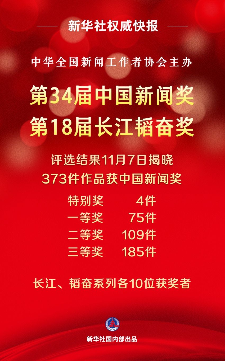 来自全国各级各类媒体的373件作品获中国新闻奖,其中,特别奖4件、一等奖75件、二等奖109件、三等奖185件。同时揭晓的还有长江韬奋奖,长江、韬奋系列各10位获奖者。