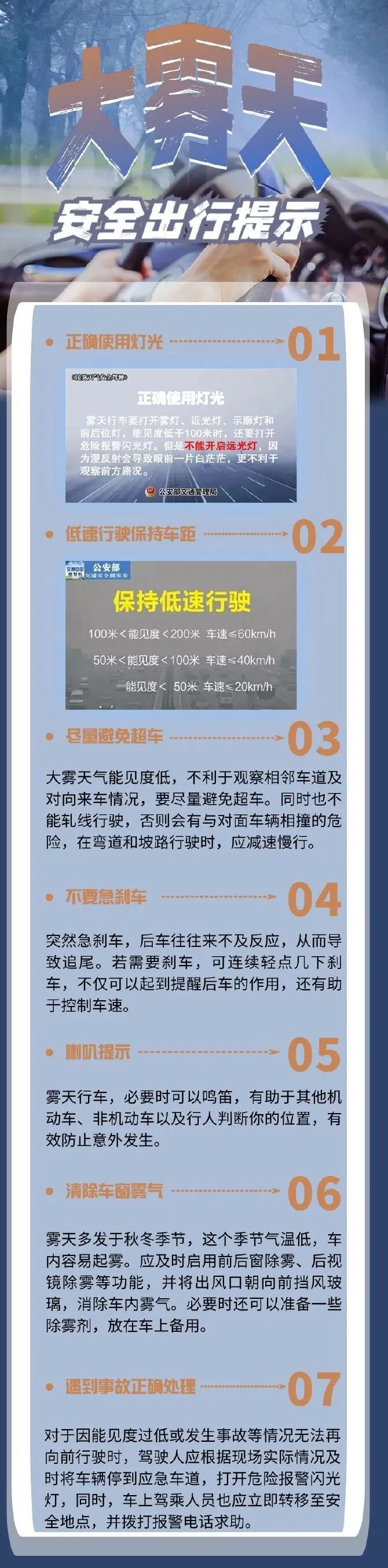 明天早晨局地仍有大雾现身。雾天行车,“慢”字当头,提醒司机朋友控制车速,加大车距;打开雾灯、近光灯、示廓灯,避免使用远光灯。