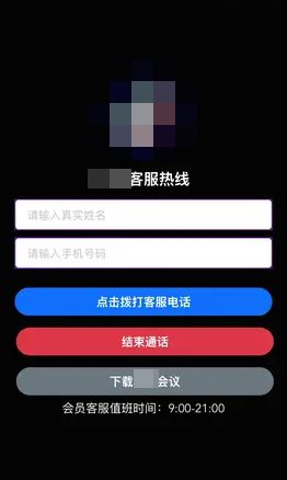 有市民点击链接后,便跳转到了某平台客服热线页面。该页面上要求填写名字、电话,还有拨打客服电话、结束通话、下载会议APP等按键。