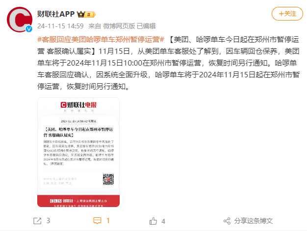15日,财联社记者从美团单车客服处了解到,因车辆回仓保养,美团单车将于2024年11月15日10:00在郑州市暂停运营,恢复时间另行通知。