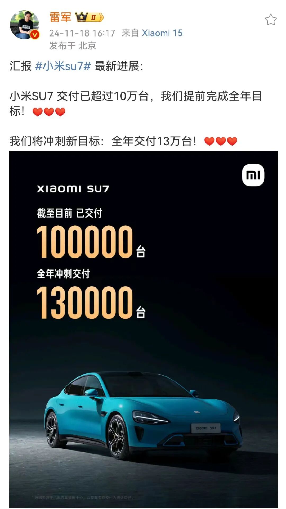 对比来看,小米方面此前冲刺的2024年全年交付目标为12万辆,并且最近一次提及该目标是在11月13日。