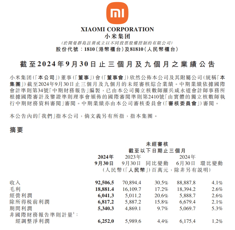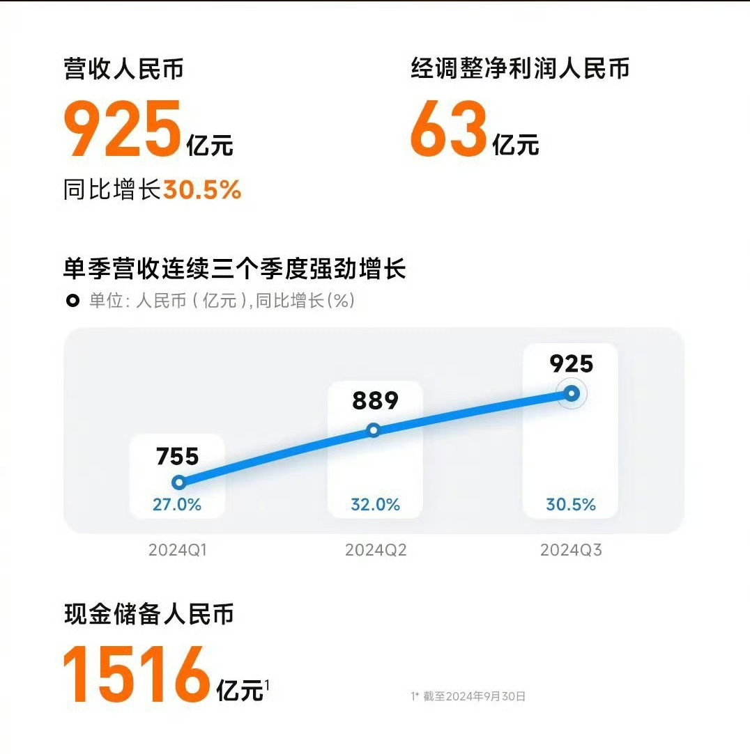 11月18日,小米集团发布2024年第三季度业绩公告,小米集团第三季度收入925.1亿元人民币,同比增长30.5%;第三季度手机×AIoT分部收入为人民币828亿元,同比增长16.8%。第三季度,小米集团经调整净利润为人民币63亿元,同比增长4.4%。