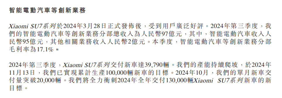 第三季度业绩公告显示,智能电动汽车等创新业务分部总收入为人民币97亿元,其中,智能电动汽车收入人民币95亿元,其他相关业务收入人民币2亿元。本季度,智能电动汽车等创新业务分部毛利率為17.1%。