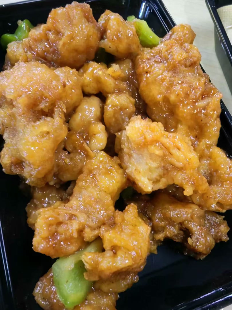 某商家评分4.5、到店评价3.5的外卖店铺,所使用的熘肉段照片