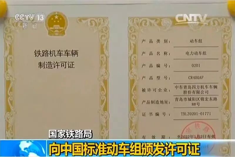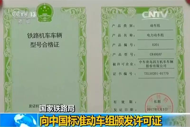 1月3日,国家铁路局向中车长春轨道客车股份有限公司、中车青岛四方机车车辆股份有限公司颁发了中国标准动车组(简称中国标动)型号合格证和制造许可证。