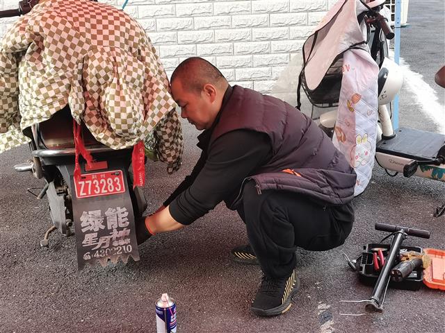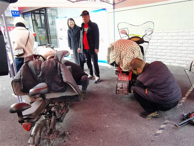 上午九点,多位居民已经将电动自行车放到检测点。检修人员一边耐心询问车主车辆的具体情况,一边利用专业工具对车辆的刹车系统、轮胎状况等进行检查,提高电动自行车的安全性能。