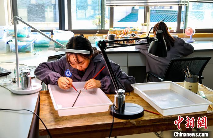 11月5日,湖北荆州文物保护中心,文物修复工作者清洗出土的竹简文物。 中新社记者 张畅 摄