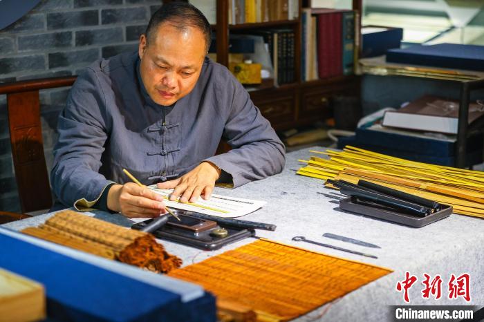 11月5日,湖北荆州楚韵阁内,黄有志在竹简上摹写。 中新社记者 张畅 摄