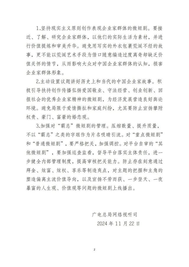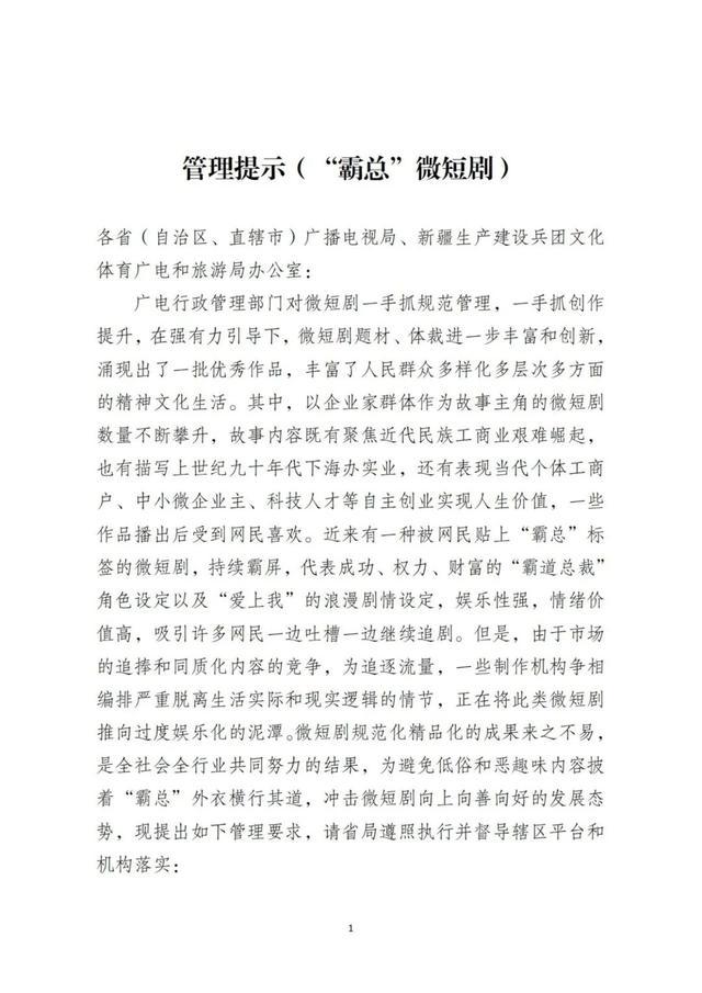 在11月22日发布的关于“霸道总裁”微短剧的管理提示强调,以企业家群体作为故事主角的微短剧数量不断攀升,一些作品播出后受到网民喜欢。但是,有一种被网民贴上“霸总”标签的微短剧,将代表成功、权力、财富的“霸道总裁”角色设定以及“爱上我”的浪漫剧情设定,当成追求流量的砝码,一些制作机构争相编排严重脱离生活实际和现实逻辑的情节。管理提示认为,这种现象正在将此类微短剧推向过度娱乐化的泥潭。