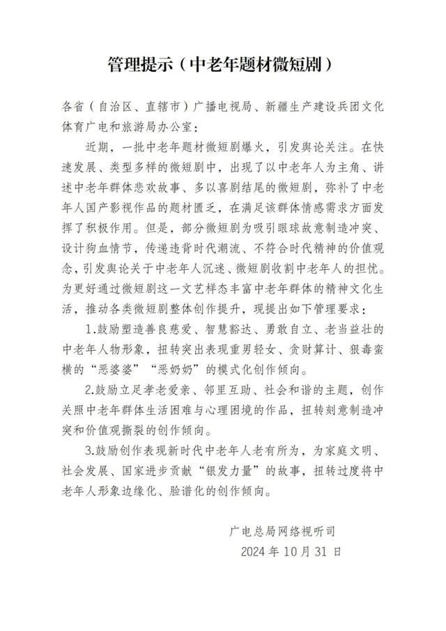 近日,广电总局网络视听司连续发布两个管理提示,对于当前在中老年题材和所谓“霸总”题材微短剧创作中出现的不良倾向,进行及时提示和规范,推动微短剧创作持续向上、向善、向美。