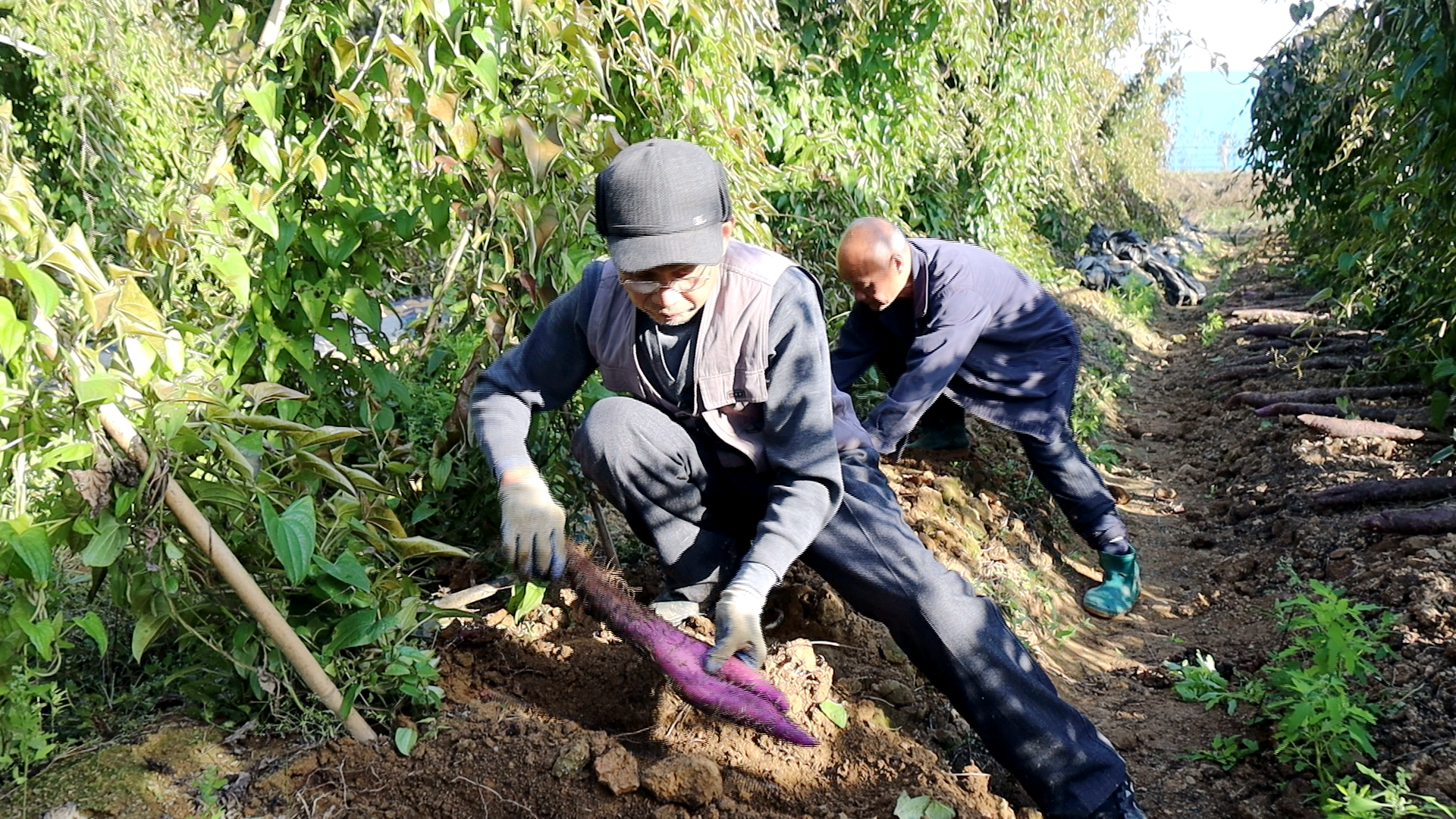 紫山药在种植、管护、采收等不同生长环节,都需要大量人工。目前,该基地一共聘用了30多名务工人员进行采收作业,其中大部分都是村民。这样不仅解决了种植户自身采收难题,还带动了村民就近就业。