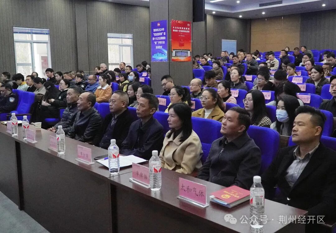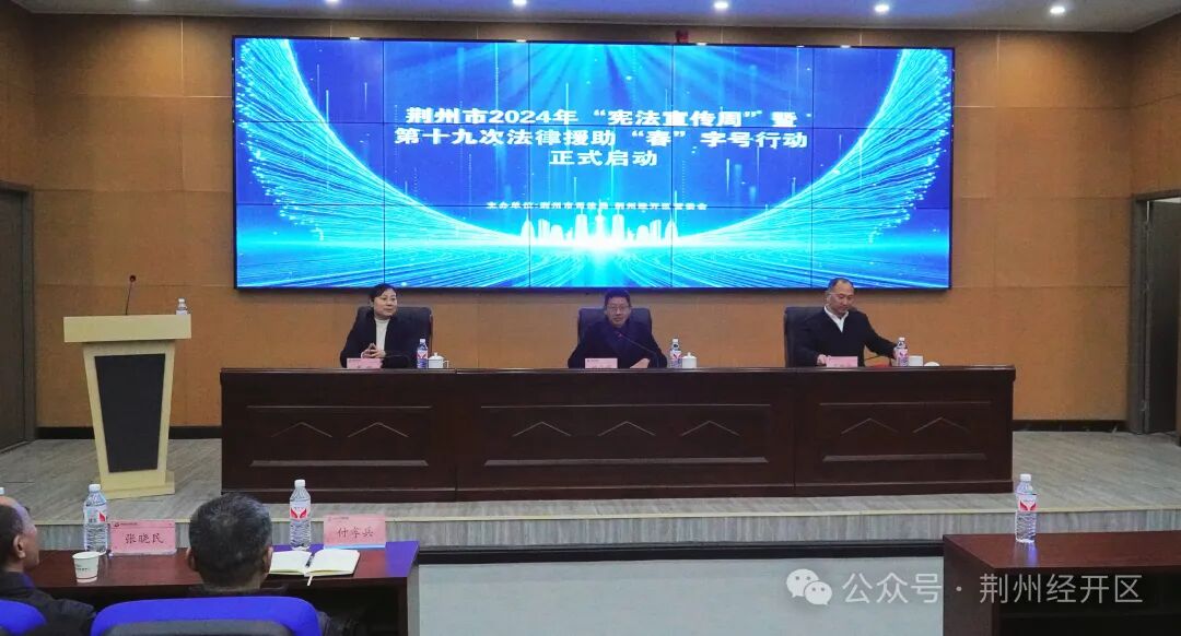 12月2日上午,由荆州市司法局、荆州经开区管委会主办的“荆州市2024年‘宪法宣传周’暨第十九次法律援助‘春’字号行动启动仪式”在经开区双创中心举行。荆州市政府副秘书长施小峰,荆州市司法局党委书记、局长王统怡,荆州经开区党工委委员、政法委书记、公安分局局长严玥参加活动。