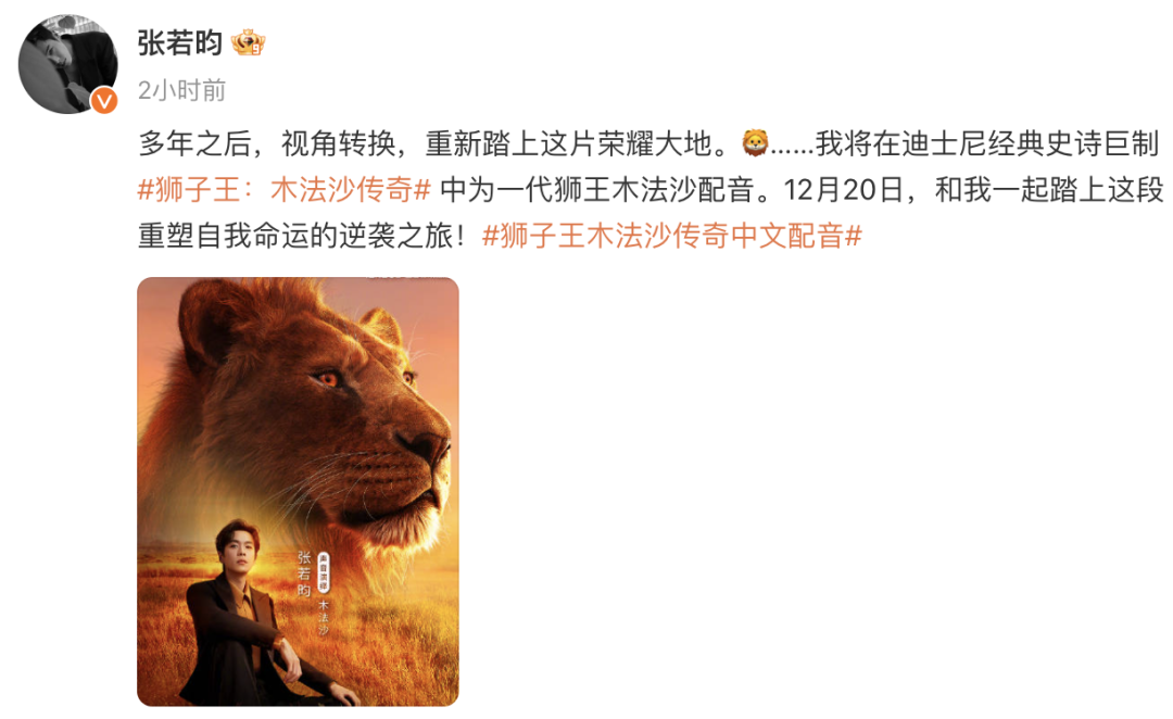演员张若昀发文称自己将为一代狮王木法沙配音。