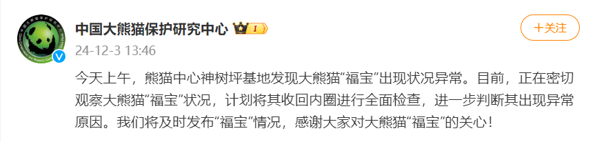 中国大熊猫保护研究中心消息,今天(12月3日)上午,熊猫中心神树坪基地发现大熊猫“福宝”出现状况异常。目前,正在密切观察大熊猫“福宝”状况,计划将其收回内圈进行全面检查,进一步判断其出现异常原因。中心将及时发布“福宝”情况,感谢大家对大熊猫“福宝”的关心。