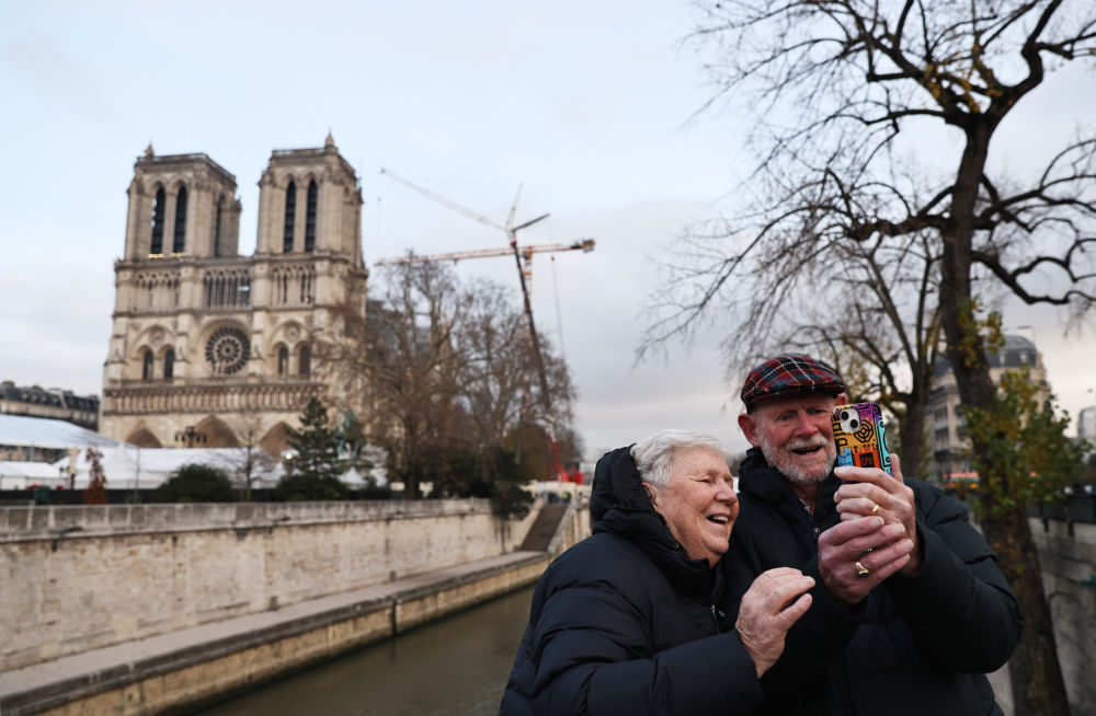 12月4日,人们在即将重新开放的法国巴黎圣母院前拍照留念。