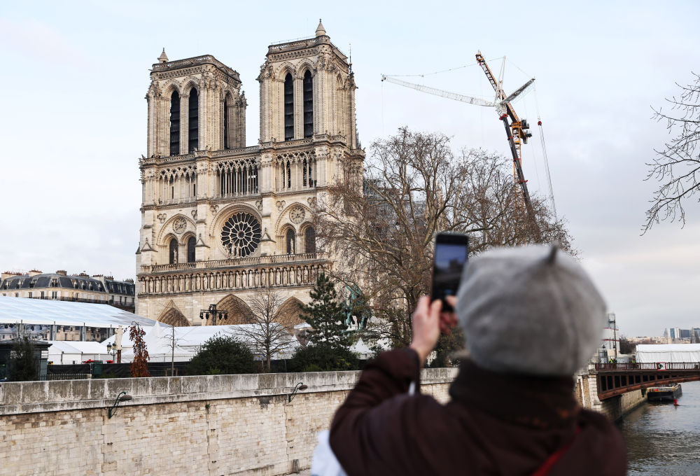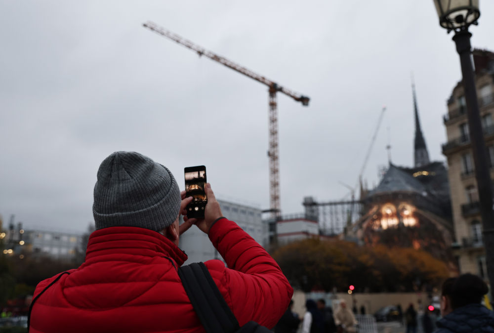 12月4日,一名路人在即将重新开放的法国巴黎圣母院前驻足拍照。
