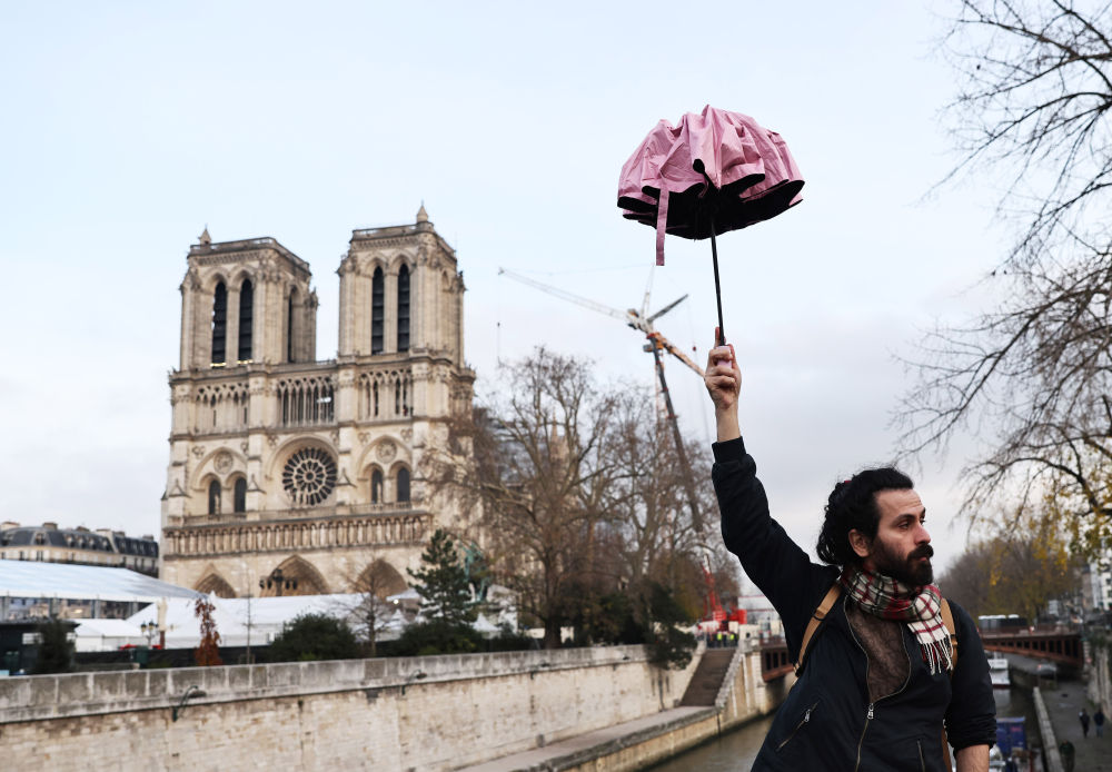 12月4日,一名导游走过即将重新开放的法国巴黎圣母院。