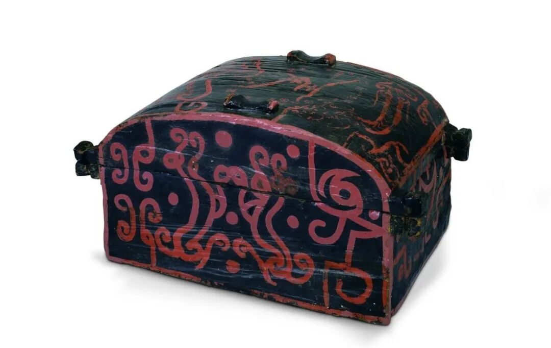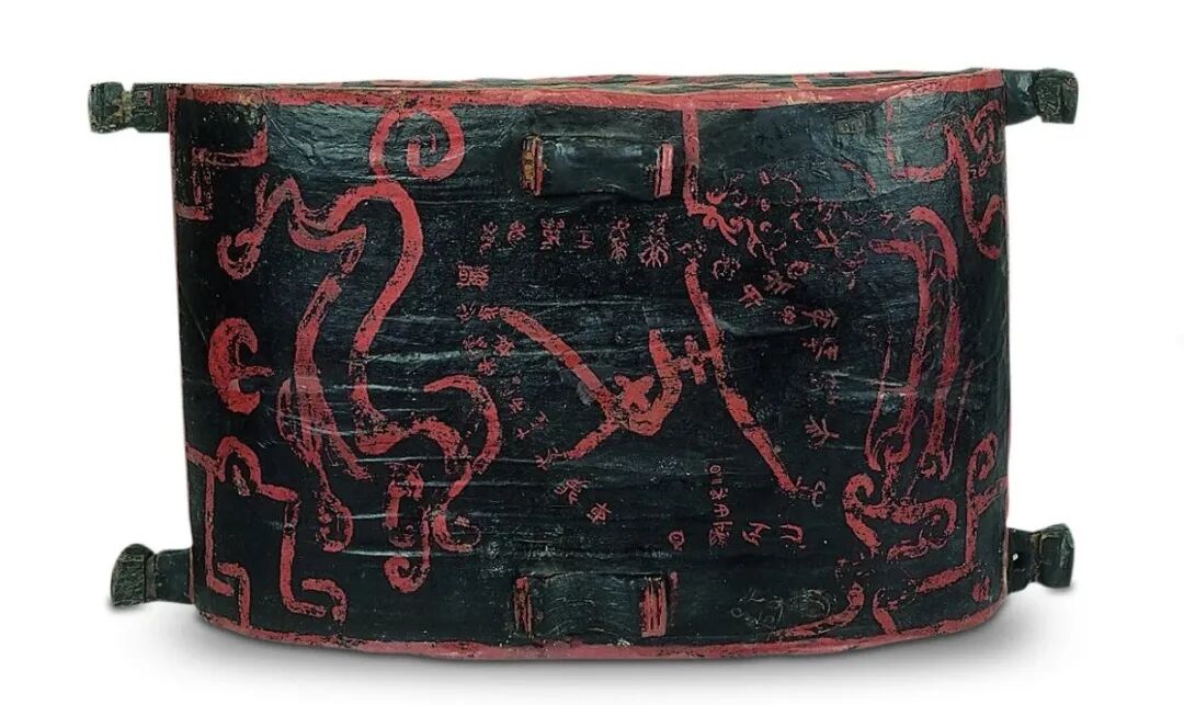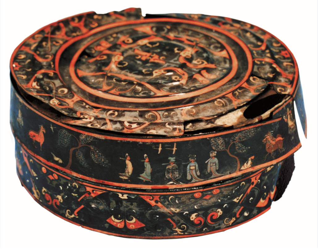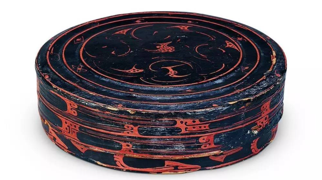 盒在器形上分圆形、椭圆形、方形几种。一般器内髹红漆,器表髹黑漆,用红、褐色彩绘纹饰。
