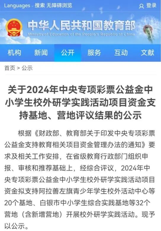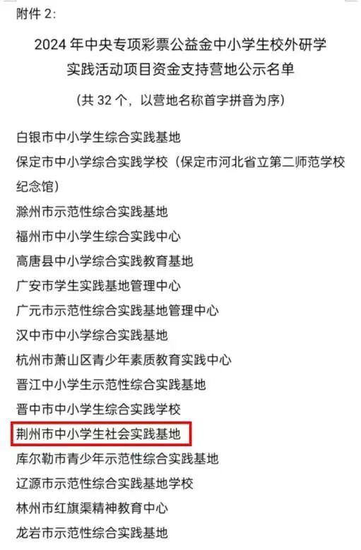 近日,教育部发布《关于2024年中央专项彩票公益金中小学生校外研学实践活动项目资金支持基地、营地评议结果的公示》,荆州市中小学生社会实践基地入选全国32个中小学生校外研学实践活动项目资金支持营地。