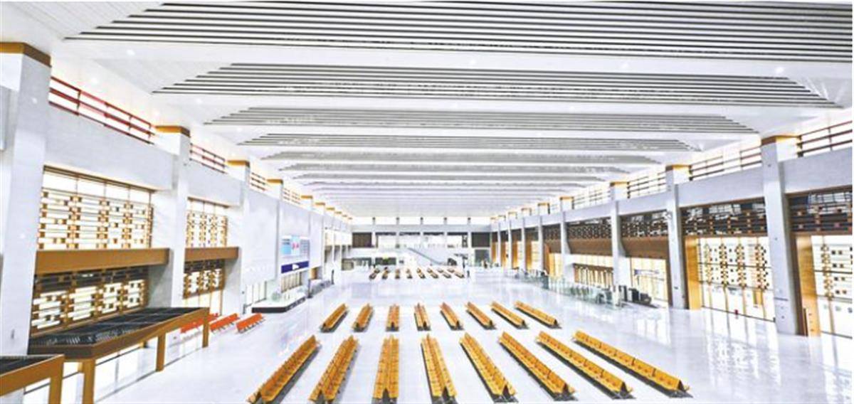 新落成的荆州火车站北站房宽敞明亮,厅内墙壁上的“虎座凤鸟架鼓”和“金凤腾飞”浮雕,既体现了楚文化特色,又彰显时代气息。