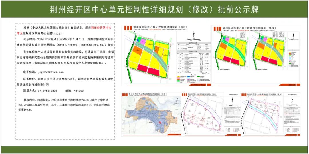 根据《中华人民共和国城乡规划法》有关规定,现将拟报批的荆州经开区中心单元控制性详细规划修改草案向社会进行批前公示,公示时间为2024年12月4日至2025年1月2日。