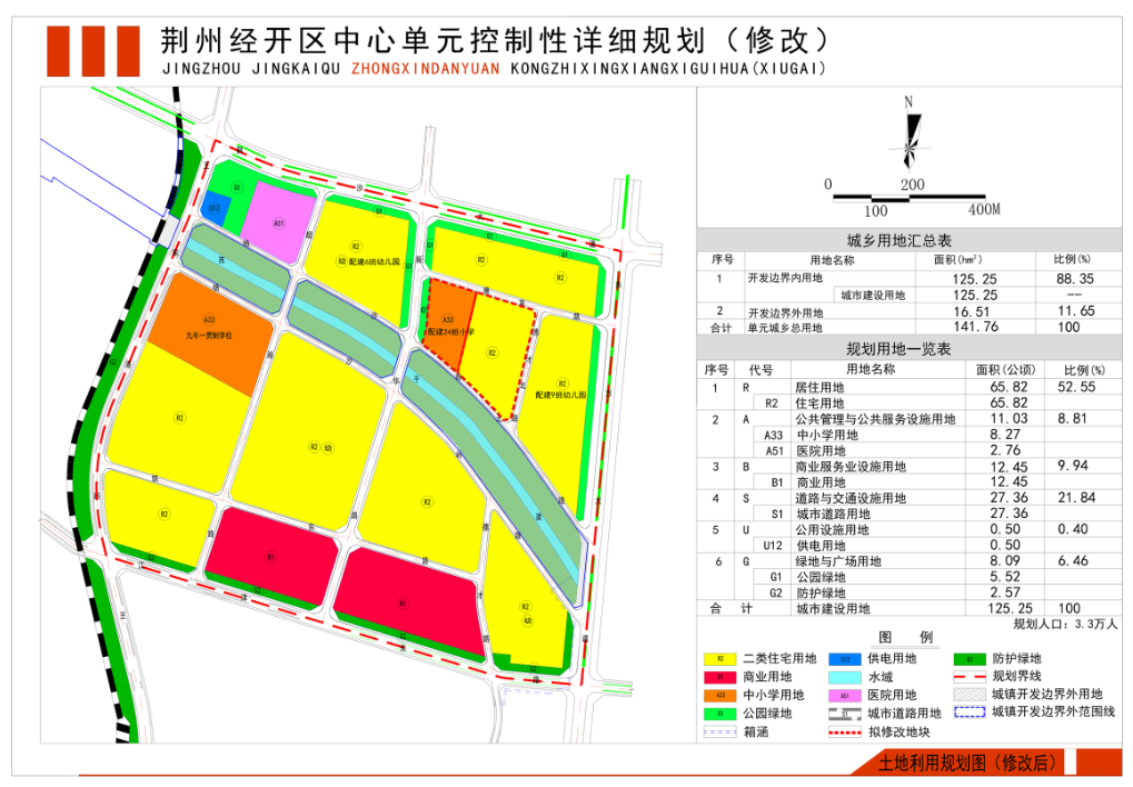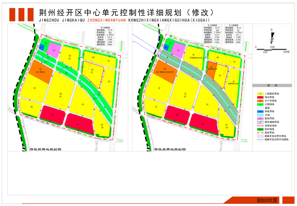 修改内容:将原规划6.49公顷二类居住用地修改为2.20公顷中小学用地和4.29公顷二类居住用地,其中,二类居住用地容积率为2.2,中小学用地容积率为0.8。