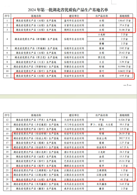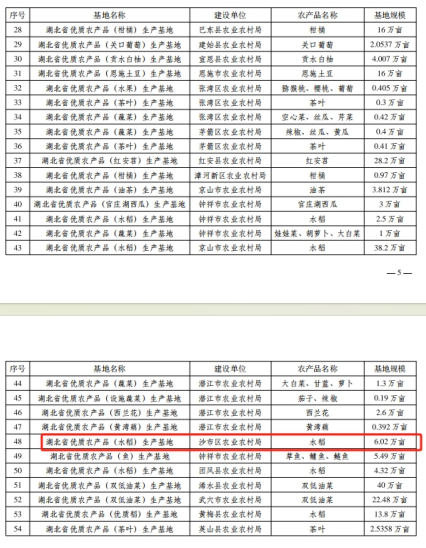 其中,荆州市优质农产品生产基地有12个,分别为:监利市农业农村局、荆州区农业农村局、石首市农业农村局、沙市区农业农村局的水稻生产基地;松滋市农业农村局的水稻生产基地、柑橘生产基地、土鸡生产基地、莲藕生产基地、松滋牛肉生产基地;江陵县农业农村局的三湖黄桃生产基地、水稻生产基地、江陵金菊生产基地。