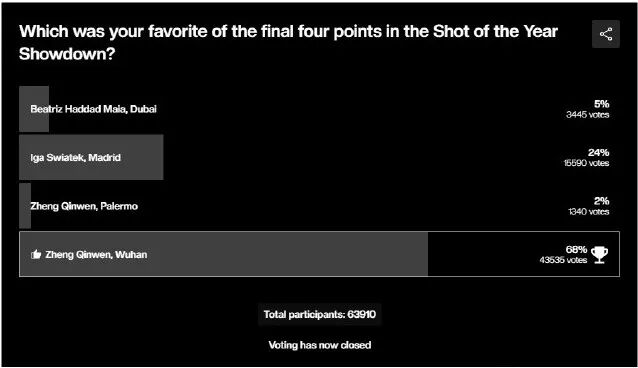 今天(12月14日),WTA官方年度最佳击球投票结果出炉,中国选手郑钦文在武汉网球公开赛对阵萨巴伦卡时的击球荣获年度最佳击球。