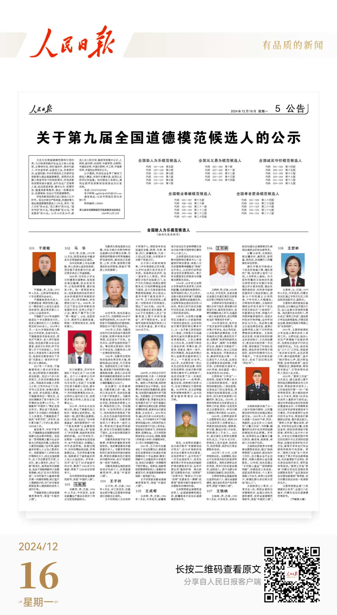 12月16日,《人民日报》刊发《关于第九届全国道德模范候选人的公示》,共确定第九届全国道德模范候选人299名,其中,“助人为乐”类63名,“见义勇为”类58名,“诚实守信”类59名,“敬业奉献”类65名,“孝老爱亲”类54名。