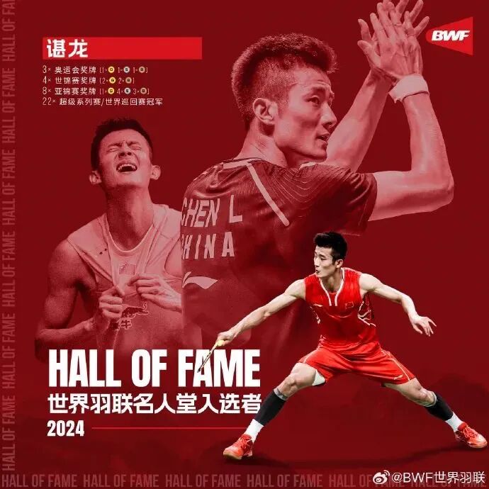 世界羽联12月9日晚举办仪式,正式确认中国选手谌龙入选2024年世界羽联名人堂。