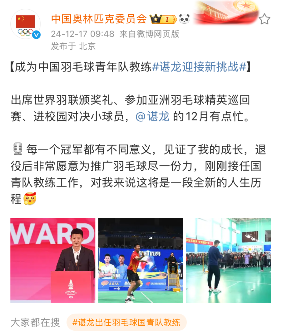 据中国奥林匹克委员会官方17日消息,谌龙成为中国羽毛球青年队教练。
