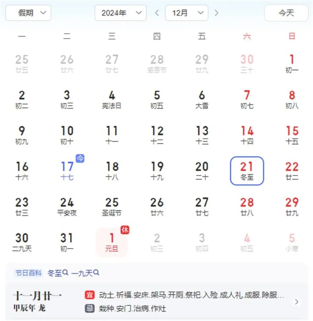其三,今年冬至,农历和阳历日期“同步”,实属罕见。天文爱好者介绍说,这里所说的“同步”并非指农历日期和阳历日期完全相同,而是指冬至发生在农历中的“日”和阳历中的“日”相同。今年冬至节气的交节日期是阳历12月21日,而冬至在农历的日期则是十一月二十一,所以今年冬至节气都是在二十一日,农历时间和阳历时间出现“同步”现象。