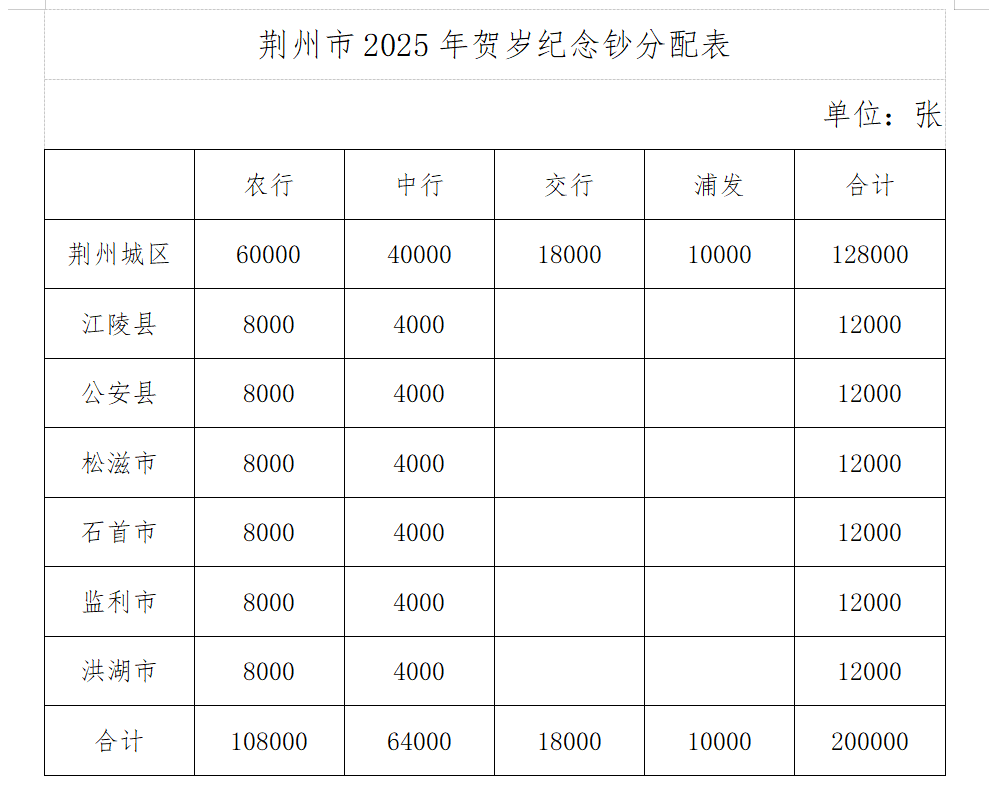 2025年贺岁币、2025年贺岁钞在荆州市预约发行工作由中国农业银行、中国银行、交通银行、上海浦东发展银行荆州分行共同承担。荆州市共分配2025年贺岁币200,000枚、2025年贺岁钞200,000张。各承办银行预约兑换网点和每个网点的预约兑换分配数量见各承办银行官方网站公告。