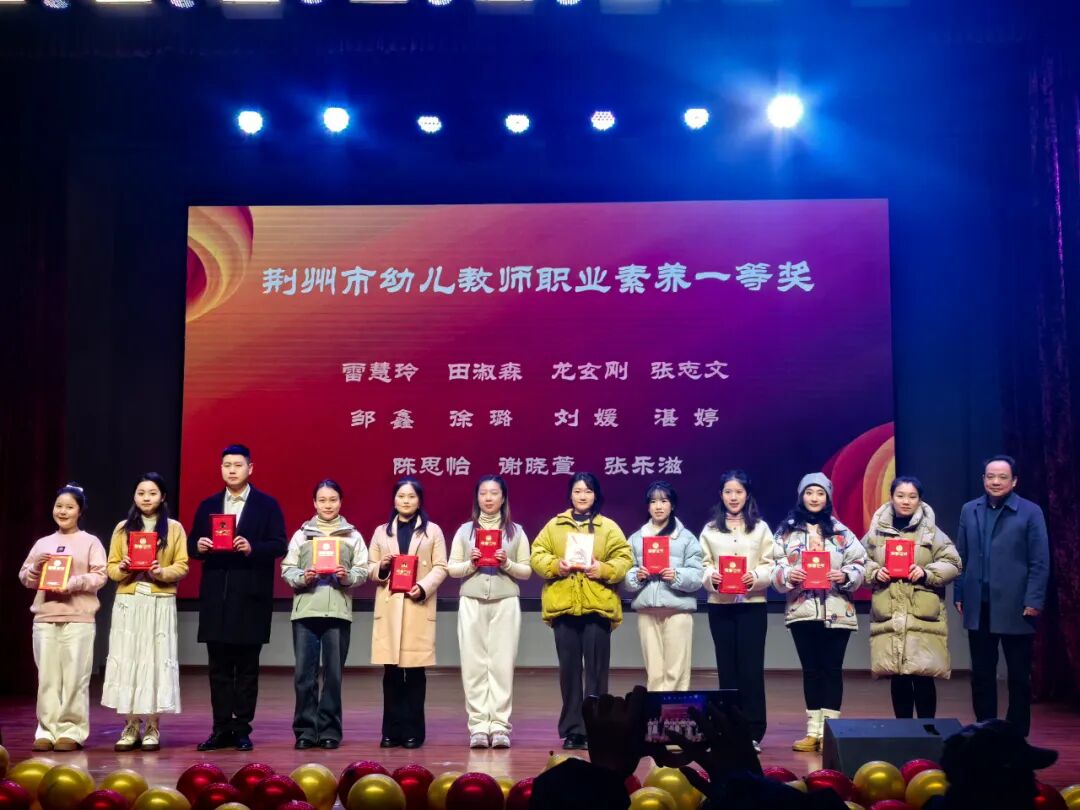 ▲张志文(左四)老师获幼儿教师职业素养比赛一等奖