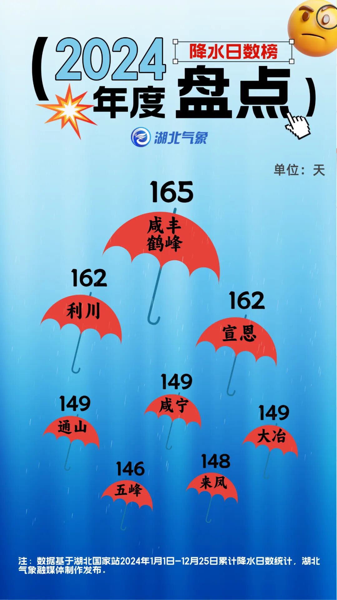 要数降雨缠缠绵绵的程度,还是鄂西南一带,鹤峰、咸丰、利川、宣恩4个县市全年降雨日数累计超过了160天。