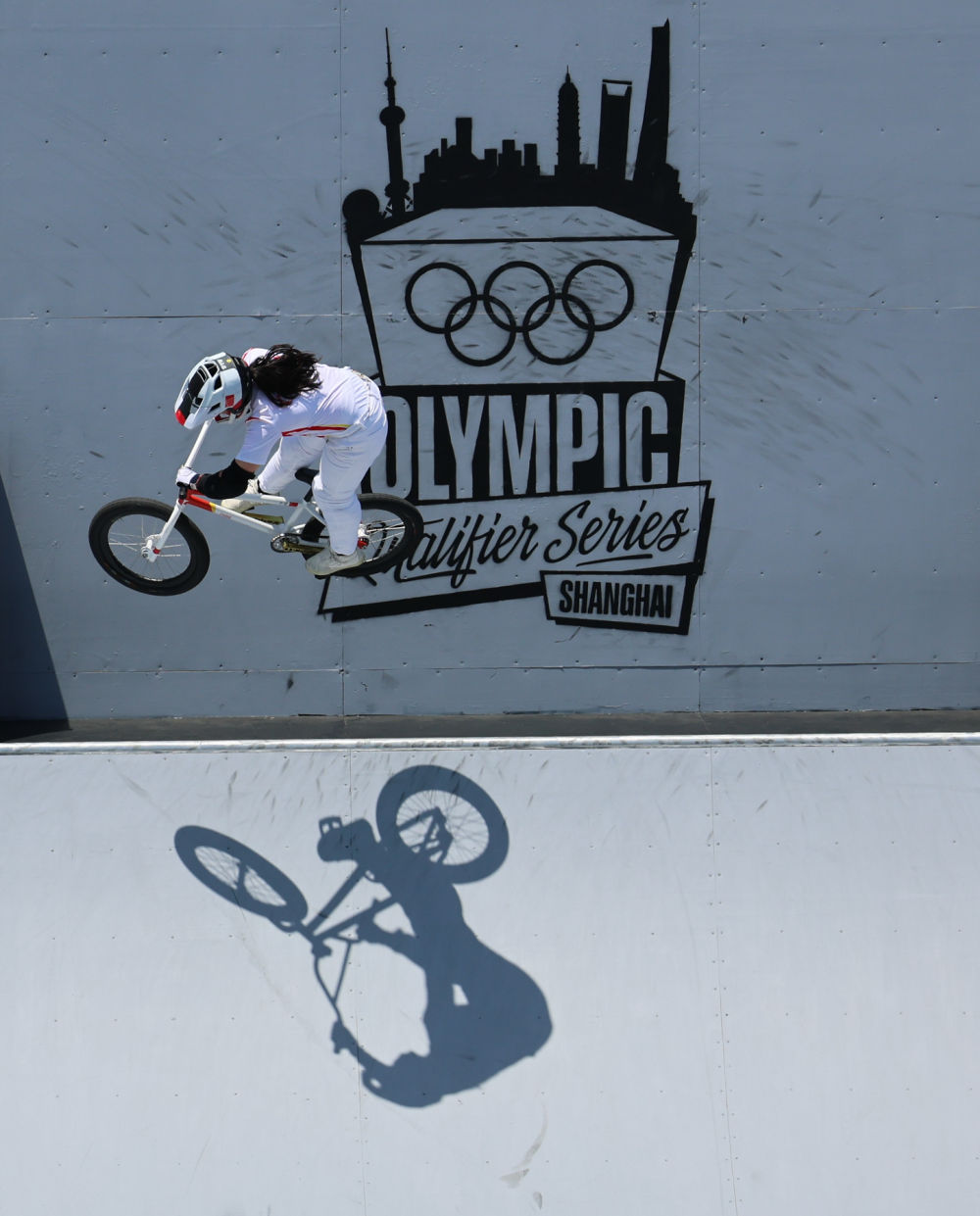 5月18日,中国选手邓雅文在巴黎奥运会资格系列赛上海站小轮车自由式女子公园赛决赛中。新华社记者 王楷焱 摄