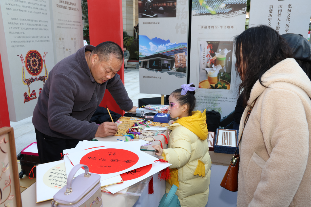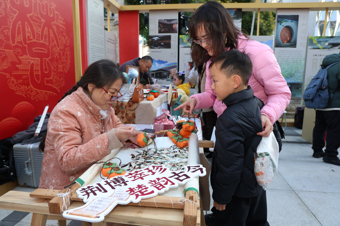 在荆州博物馆展区前,楚绣、楚简等系列荆州非遗文创产品,吸引游客驻足品鉴。荆州楚绣非遗传承人汪宣珍老师现场展示的楚绣技艺,让人赞叹不已。