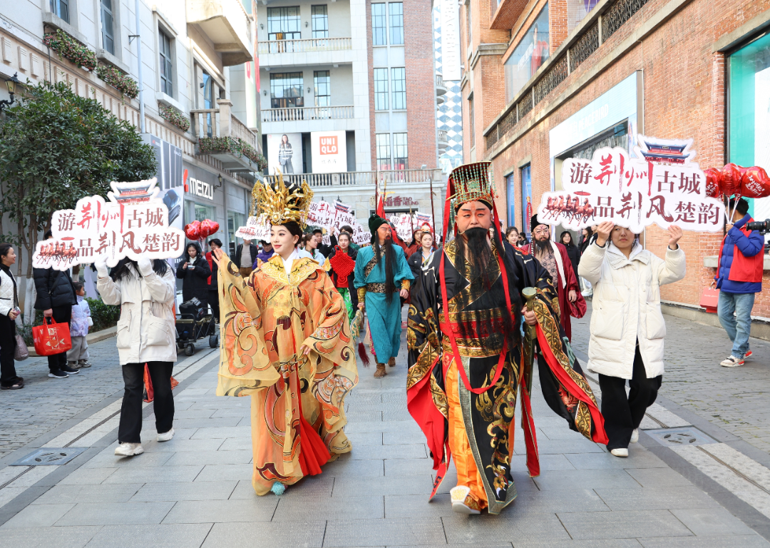 今天,在楚河汉街“一线两区”,刘关张情景短剧演绎,“屈原”与游客现场对辞,“楚王”引领楚礼表演等互动节目继续精彩上演。荆州文旅宣传片的滚动播出,也让大家真实感受到了古城荆州的魅力与文化。