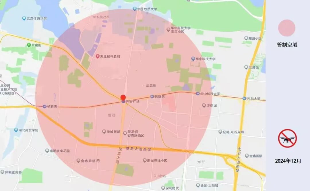 (二)光谷广场周边区域内,真高120米及以下空域(附件2):以光谷广场环岛为中心,半径1.5公里范围内,南至金地·阳光城南苑、西至五环天地、北至南望山庄教师小区、东至泛悦城2期。